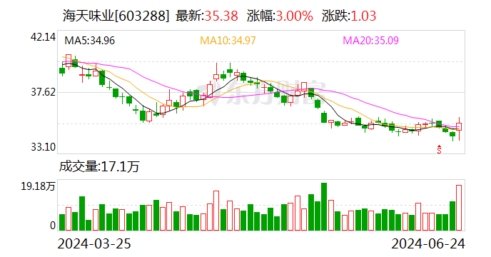 海天味业6月24日大宗交易平台出现一笔成交,成交量35.50万股,成交金额1159.08万元,大宗交易成交价为32.65元,相对今日收盘价折价7.72%。该笔交易的买方营业部为国泰君安证券股份有限公司江阴环城北路证券营业部,卖方营业部为华泰证券股份有限公司天津东丽开发区二纬路证券营业部。 进一步统计,近3个月内该股累计发生38笔大宗交易,合计成交金额为1.72亿元。 证券时报·数据宝统计显示,海天味业今日收盘价为35.38元,上涨3.00%,日换手率为0.31%,成交额为6.01亿元,全天主力