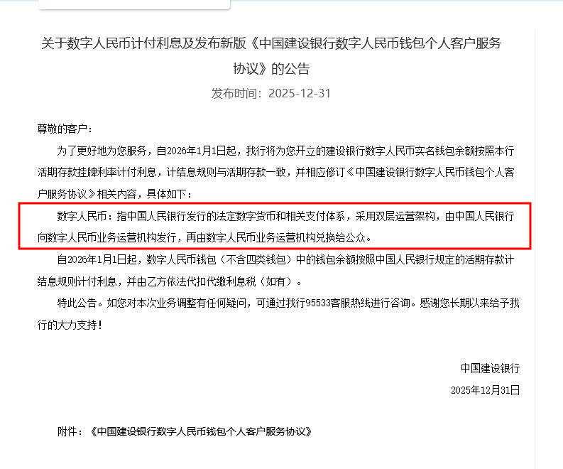 与此同时,建设银行也公告,自2026年1月1日起,中国建设银行将为客户开立在该行的数字人民币实名钱包余额按照活期存款挂牌利率计付利息,计结息规则与活期存款一致。
