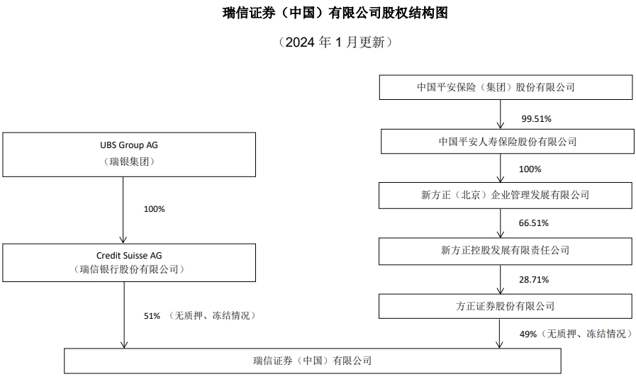 2020年6月,瑞信以非公开协议方式,单方面向瑞信证券增资后,瑞信持股占比增至51%,方正证券持股占比则降至49%。